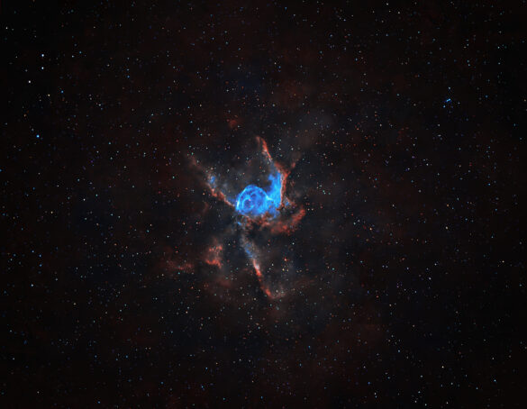 La Nebulosa Elmo di Thor Ngc2359 è una delle più famose nebulose e si trova a circa 15.000 anni luce di distanza dalla terra, nella costellazione del Cane Maggiore. La sua particolare forma è dovuta a venti stellari illuminati da una caldissima stella Wolf-Rayet (WR7). La ripresa è stata effettuata da Milano con cielo Bortle 9