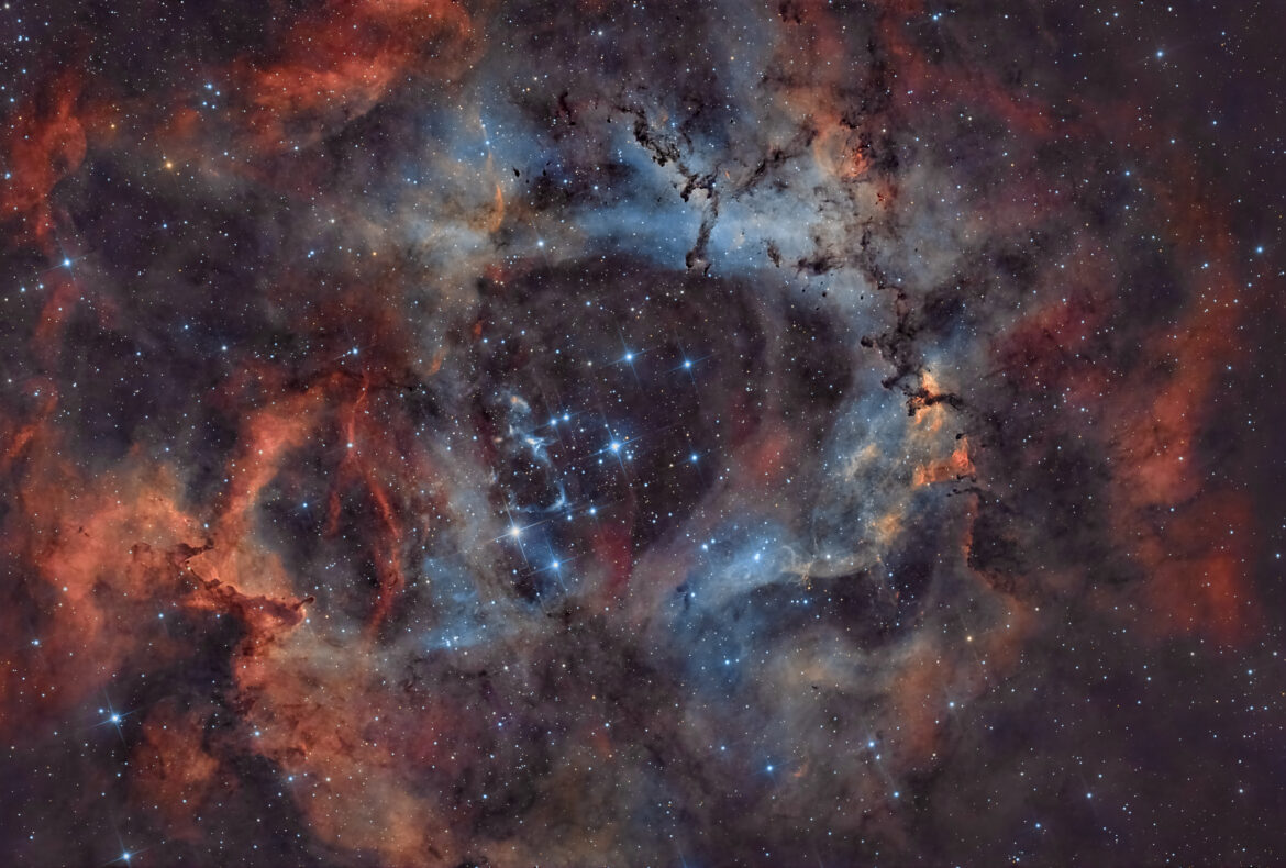 La Nebulosa Rosetta (conosciuta anche come NGC 2237 o C 49) è una grande regione di emissione situata nella costellazione dell’Unicorno. Al centro della nebulosa c’è un ammasso aperto luminoso, noto come NGC 2244, le cui stelle blu emettono radiazioni ultraviolette che eccitano il gas nella nebulosa che a loro volta emettono luce.