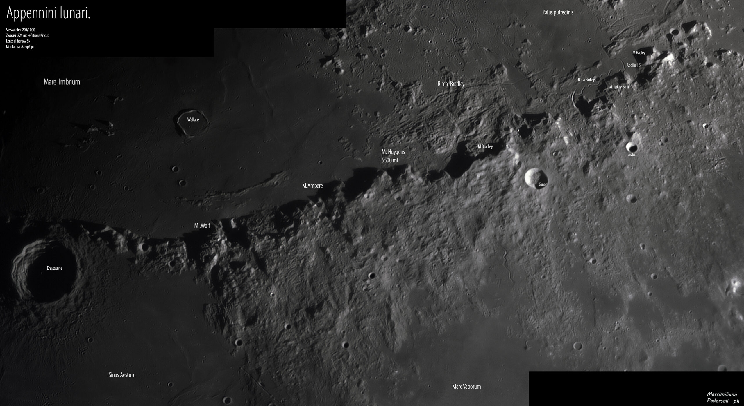 Gli Appennini lunari sono una delle strutture geologiche più belle e caratteristiche da riprendere, per via delle montagne molto alte che compongono questa catena montuosa, la più estesa della superficie lunare, 600 km circa. Si trova sul bordo sud-est del Mare Imbrium e ne delimita i confini.Circa a metà della loro estensione si trova il Monte Huygens che con i suoi 5500 mt è la montagna più alta della luna.