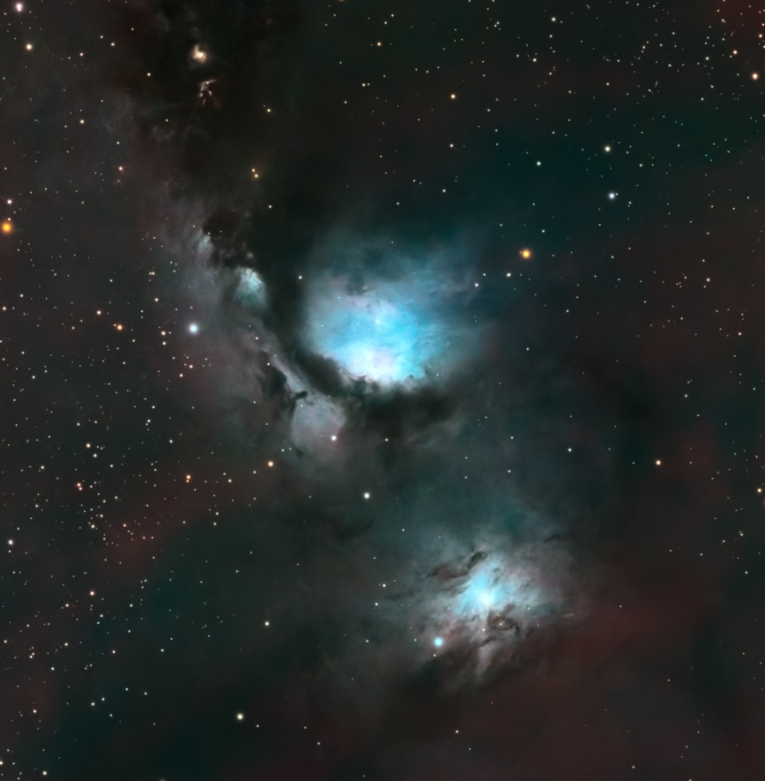 M78 è una delle regioni più luminose del complesso di nubi molecolari di Orione. Il suo bagliore azzurro è dovuto alla luce di giovani stelle che viene riflessa dalle polveri interstellari, creando un effetto spettacolare nel cielo invernale. Grazie all’integrazione in H-alpha, si riescono a evidenziare anche tenui dettagli di gas ionizzato che normalmente resterebbero invisibili nelle sole riprese RGB.
