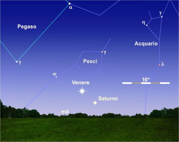 Rimasta “orfana” di Mercurio, la coppia Venere–Saturno sta lentamente emergendo dalle luci dell’alba, diventando osservabile con maggior facilità, soprattutto il pianeta inanellato, la cui luminosità non è ottimale, mancando il contributo del sistema di anelli che lo circonda, attualmente invisibile perché posizionato “di taglio”.