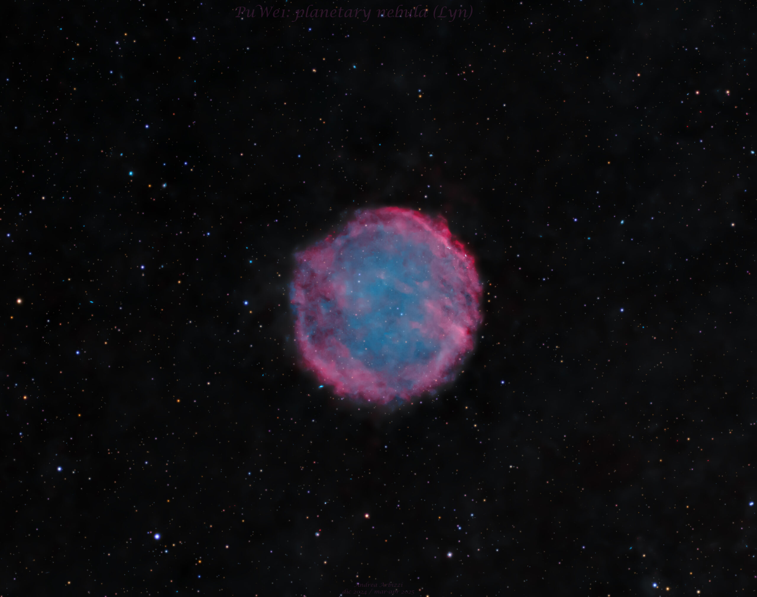 Purgathofer-Weinberger 1 (PuWe1) è una grande nebulosa planetaria circolare nella costellazione della Lince, scoperta da Alois Purgathofer e Ronald Weinberger nel 1980 analizzando le lastre del Palomar Deep Sky Survey. E’ una delle più grandi nebulose planetarie dei nostri cieli ed è un oggetto estremamente debole e sfuggente che avrebbe richiesto molte più ore di integrazione dal mio cielo inquinato cittadino di pianura.