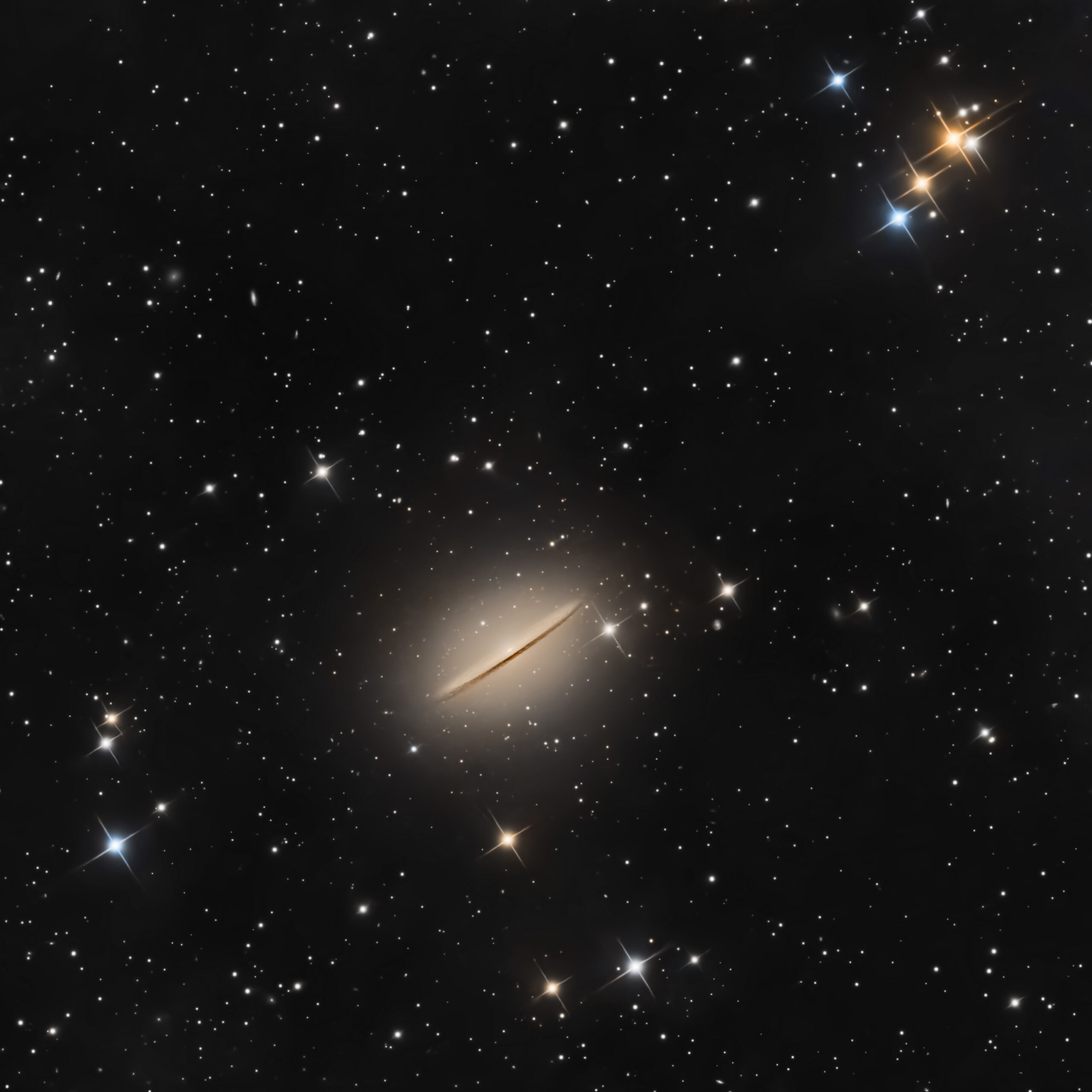 Messier 104 (nota anche come Galassia Sombrero, M104 o NGC 4594) è una maestosa galassia a spirale non barrata situata nella costellazione della Vergine. La galassia ha una magnitudine apparente di 8,98 e si trova a una distanza di 29,3 milioni di anni luce dalla Terra. Occupa un’area di 8,7 per 3,5 minuti d’arco di dimensione apparente, corrispondente a un diametro lineare di circa 50000 anni luce, ed è inclinata di soli 7 gradi rispetto alla nostra linea di vista, apparendo di taglio.