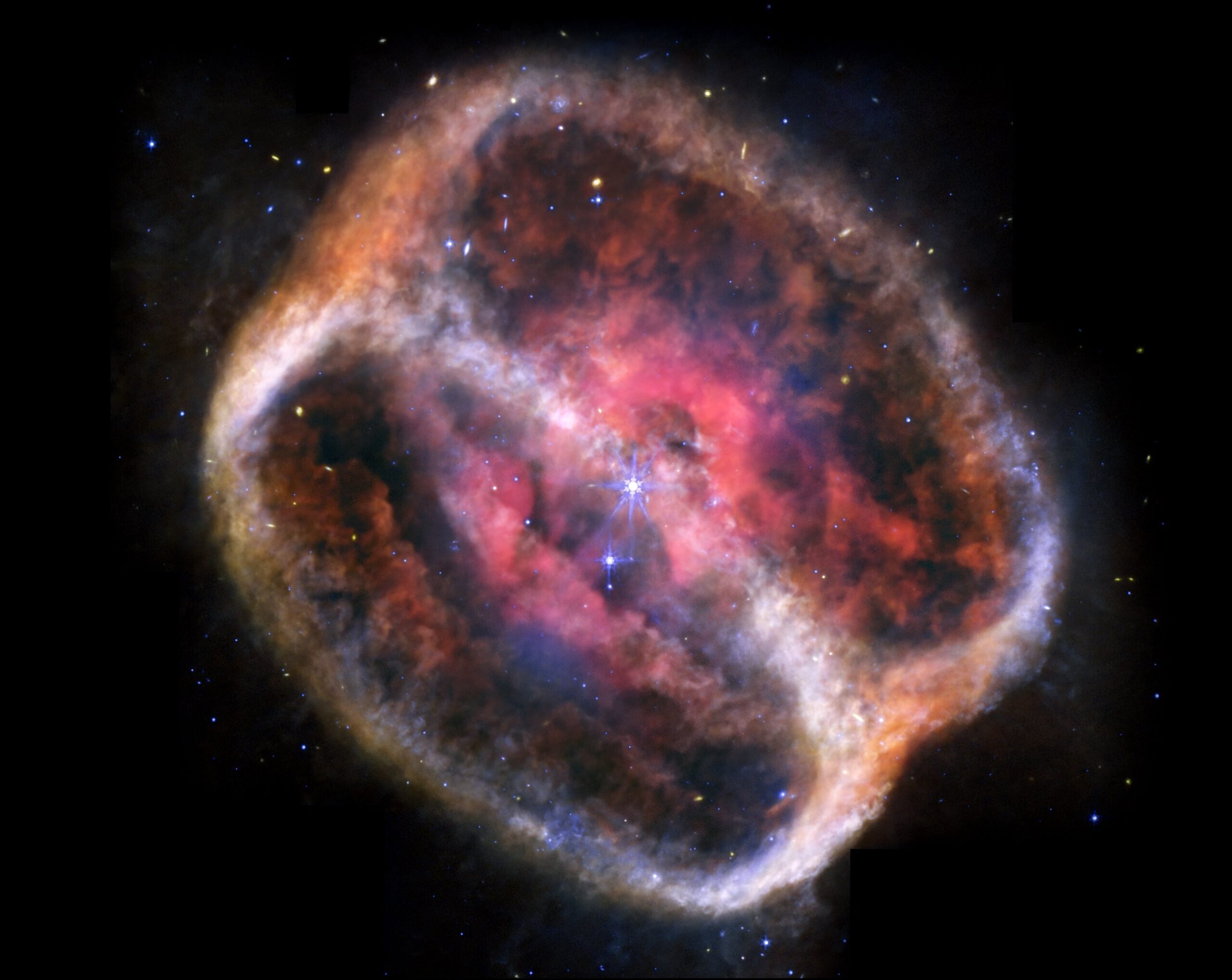 Il telescopio spaziale James Webb ha osservato con lo strumento Miri la nebulosa planetaria NGC 1514 nella costellazione del Toro, svelando la natura turbolenta di questo oggetto celeste di cui già nel 2010 era stato scoperto un sistema di anelli che la circonda. Grazie alle sue osservazioni nel medio infrarosso, Miri ha ripreso le sfumature della nebulosa, in particolare i suoi anelli polverosi “sfocati” e i “buchi” nella regione centrale di colore rosaceo.