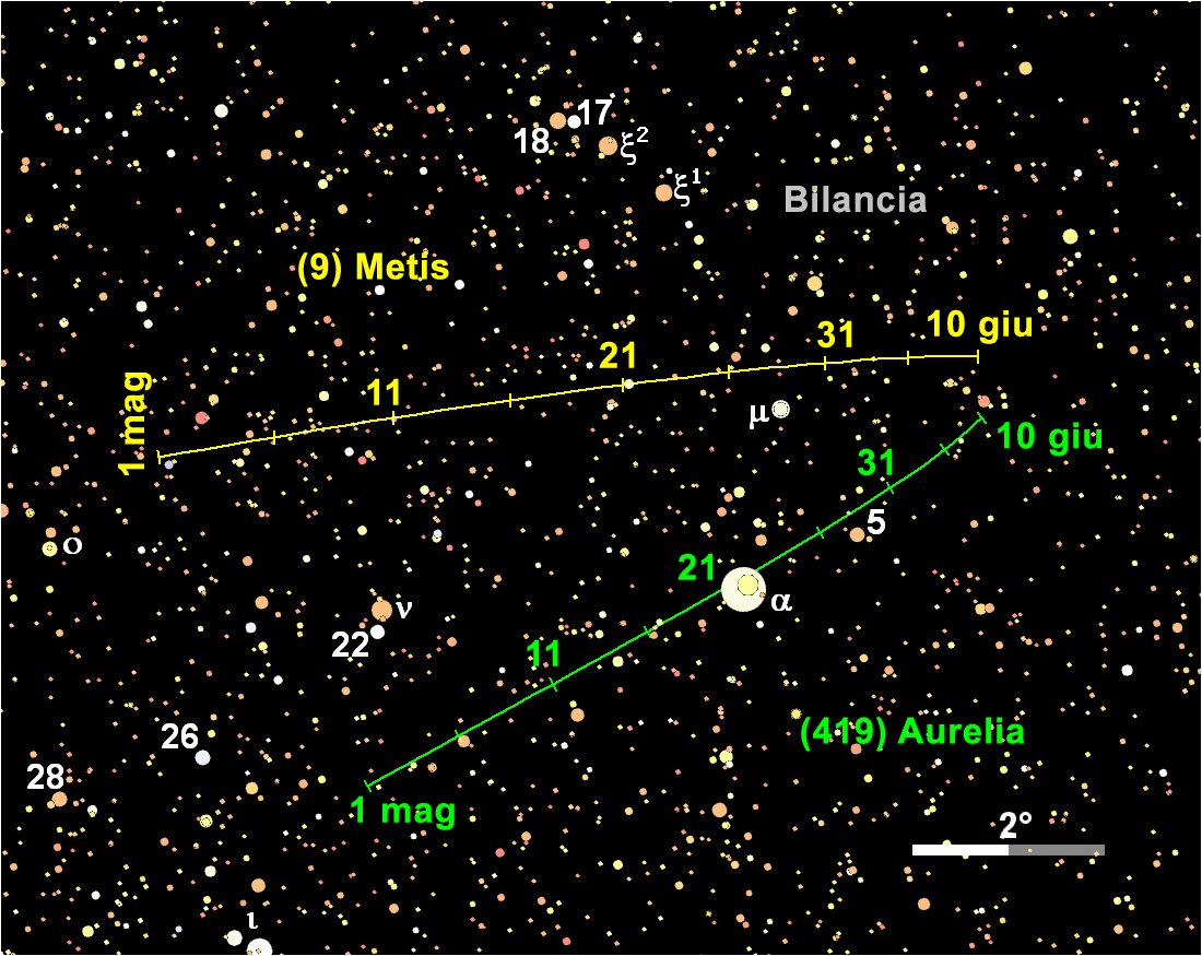 Il più brillante è (9) Metis, di magnitudine +9,7, ritracciabile alcuni gradi a nord-est di Alfa Librae, di magnitudine +2,7. Il secondo è (419) Aurelia, di magnitudine +10,3, inizialmente rintracciabile 2° a nord-ovest della coppia di stelle Iota1 e Iota2 Librae di 4a e 6a magnitudine. La notte tra il 20 e 21 maggio (419) Aurelia transita 6’ a nord di Alfa Librae, mentre il 13 giugno i due asteroidi raggiungono la minima distanza apparente l’uno dall’altro di 29’. La mappa è completa fino alla magnitudine +11,0.