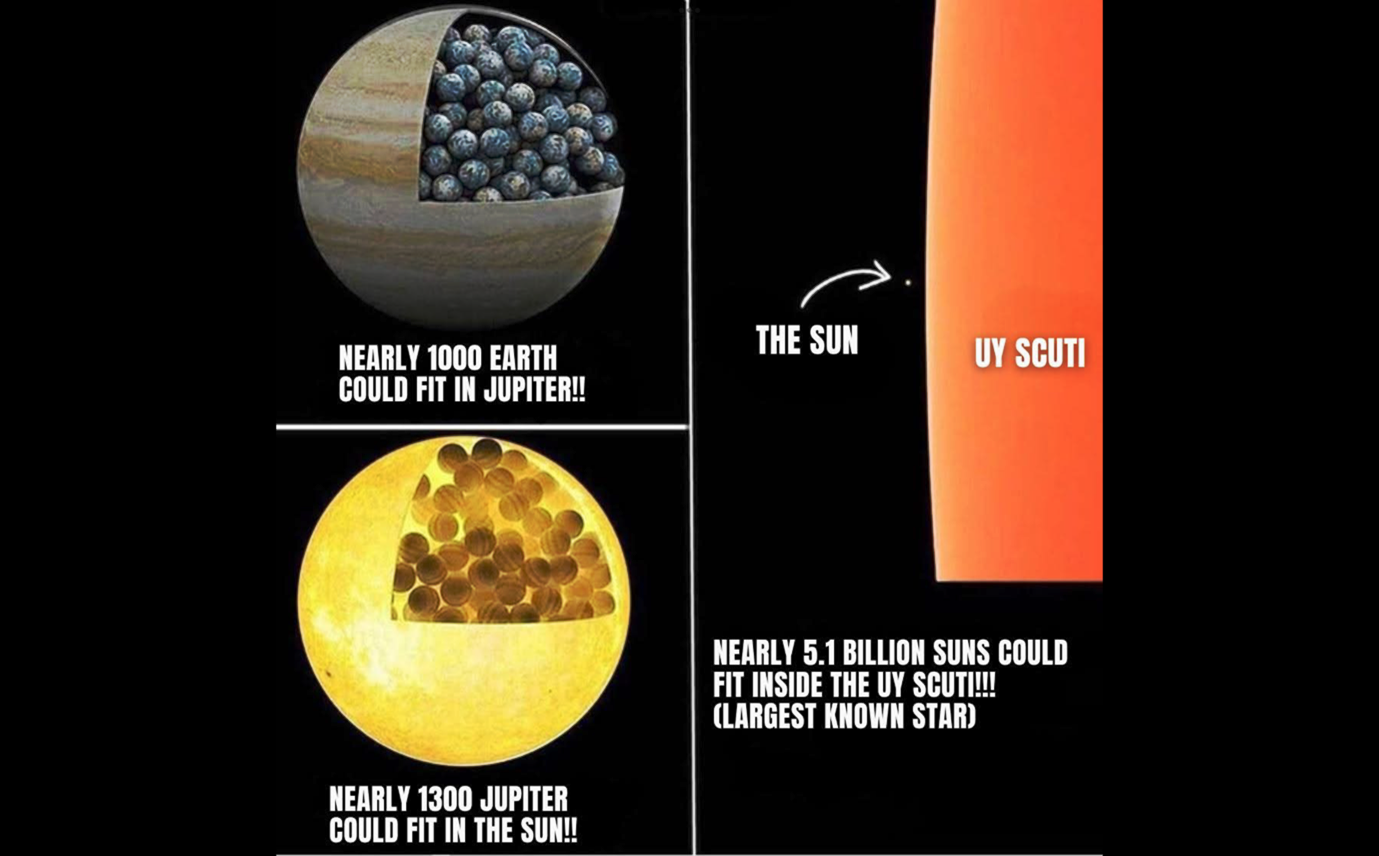 Quasi mille pianeti come la Terra potrebbero stare nel pianeta Giove e a sua volta circa 1300 pianeti come Giove potrebbero stare dentro il Sole. Una volta compreso quanto è grande la nostra stella, riusciamo a immaginare le dimensioni della stella UY Scuti, la più grande conosciuta, che potrebbe contenere 5,1 miliardi di stelle come il Sole?