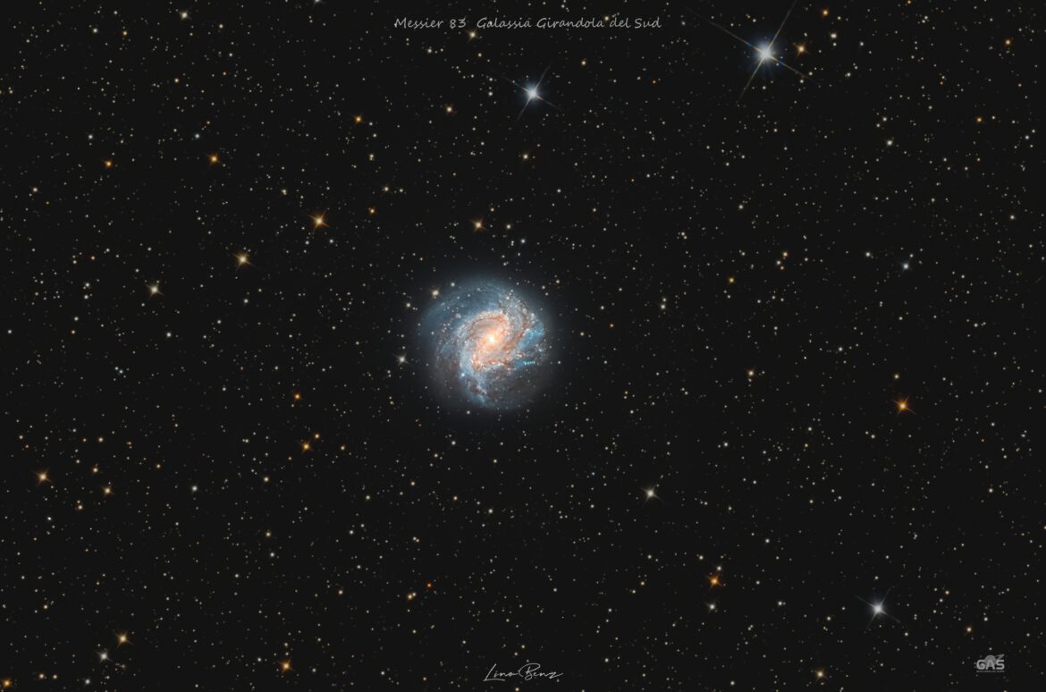 Galassia Girandola del Sud (nota anche come M83 o NGC 5236) è una galassia a spirale intermedia visibile nella costellazione dell’Idra. È una delle galassie a spirale più vicine e luminose nel cielo, ed è individuabile anche con un binocolo. Il suo nome “Galassia Girandola” è dovuto ai suoi bracci a spirale. M83 appare vista quasi perfettamente di faccia, pertanto è ben studiata e le sue strutture dei bracci sono ben conosciute, la sua distanza è stimata sui 15 milioni di anni luce appena, diventando così una delle galassie più vicine a noi. Il suo moto nello spazio tuttavia la fa allontanare da noi alla velocità di 337 km/s.