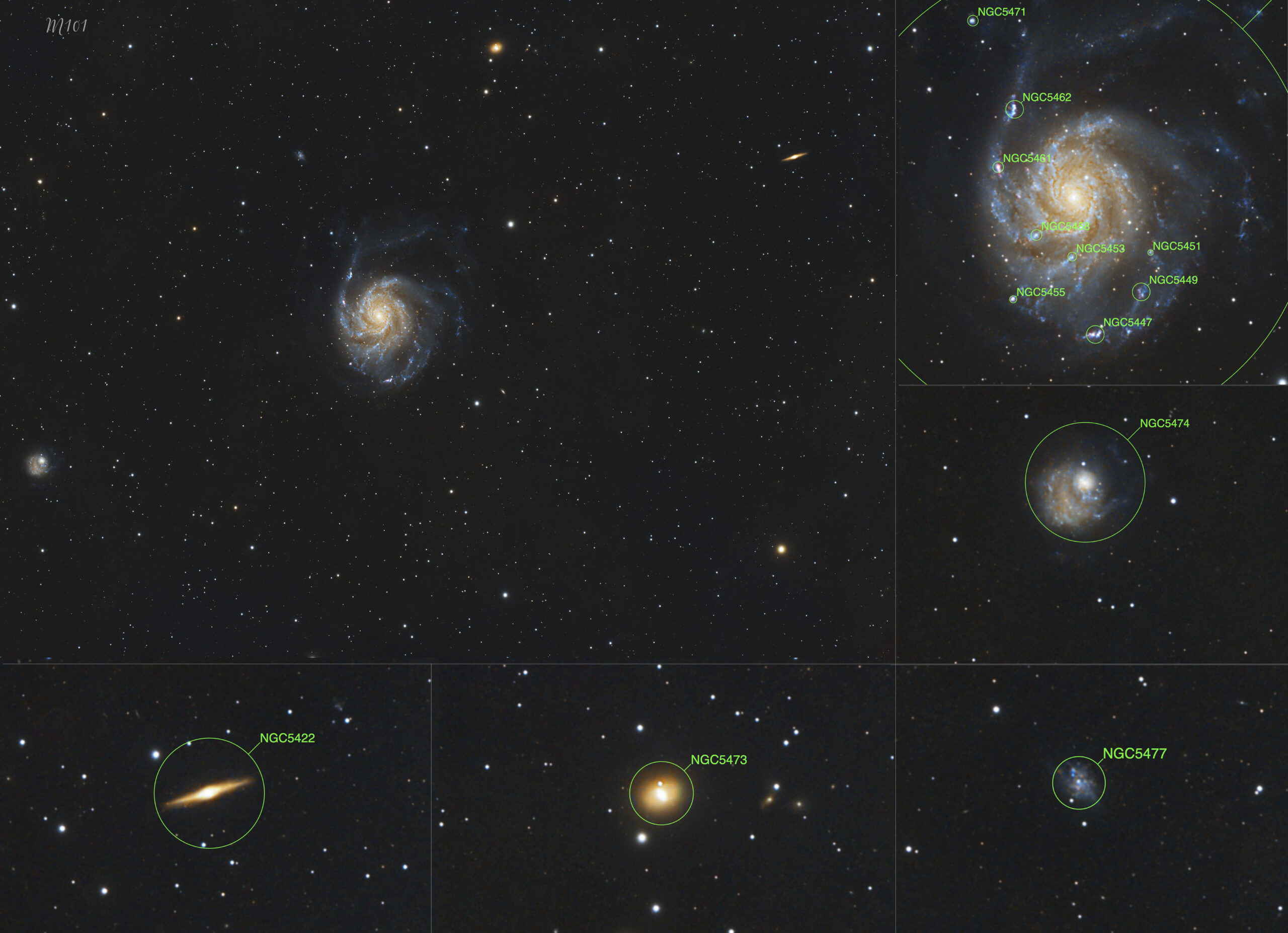 Numerosi oggetti NGC visibili nel campo: NGC 5474, NGC 5477, NGC 5422, NGC 5473, oltre a deboli galassie PGC e probabili accenni di IFN (Integrated Flux Nebula) in campo ampio.