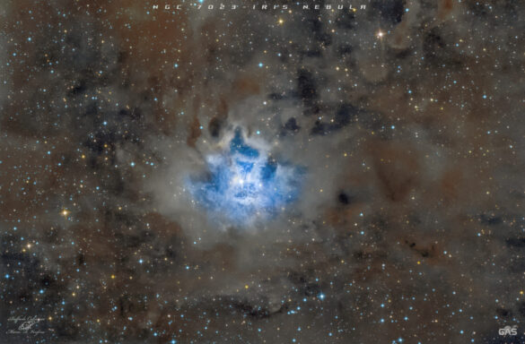 NGC 7023, conosciuta come Iris Nebula, è una bellissima nube di gas e polvere che riflette la luce di una giovane stella blu. Si trova nella costellazione di Cefeo, a circa 1.300 anni luce da noi. Il colore blu tipico viene dalla luce della stella che rimbalza sulla polvere spaziale. La zona attorno alla Iris è piena di polveri deboli, chiamate IFN, che si vedono solo con lunghe esposizioni da cieli molto bui.