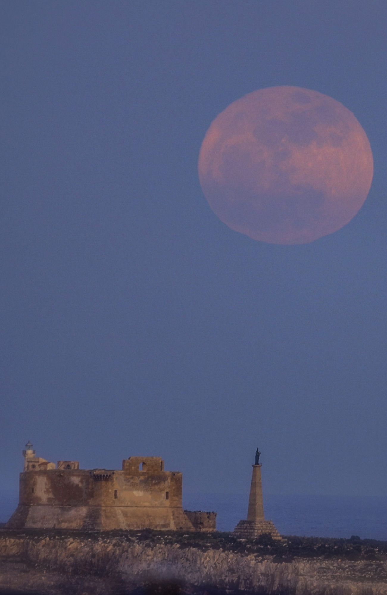 Foto di GIOVANNI PASSALACQUA: Luna rossa dei fiori sorge sopra la fortezza antica dell’isola di Capo Passero (Portopalo)