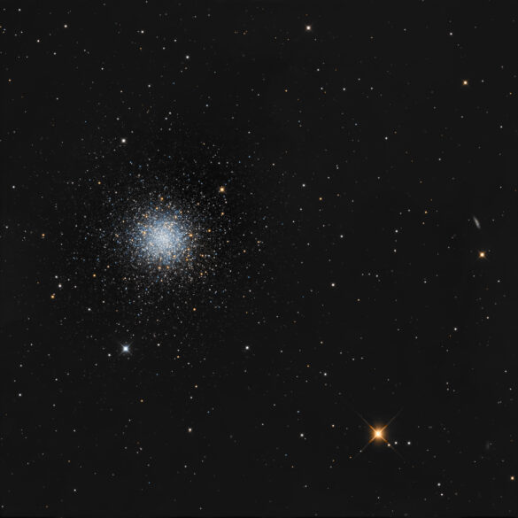 M3 è uno dei circa 250 ammassi globulari noti nella Via Lattea. L’ammasso si trova a 38800 anni luce dal centro galattico e 31600 anni luce sopra il piano della Via Lattea, nell’alone galattico. Osservato dalla Terra, l’ammasso si trova in direzione dello spazio intergalattico, opposto al centro galattico. Il nucleo denso di M3 misura 1,1 minuti d’arco di diametro, corrispondenti a 11 anni luce, mentre l’intero ammasso si estende per circa 180 anni luce, corrispondenti a un diametro apparente di 18 minuti d’arco. Si ritiene che Messier 3 abbia un’età compresa tra 8 e 11,4 miliardi di anni e contiene principalmente stelle rosse e vecchie. L’ammasso ospita anche un numero insolitamente elevato di stelle variabili. M3 è il prototipo dell’ammasso di tipo I di Oosterhoff, ovvero un ammasso globulare ricco di metalli (relativamente parlando), ovvero con un’elevata abbondanza di elementi diversi da idrogeno ed elio rispetto ad altri ammassi globulari.