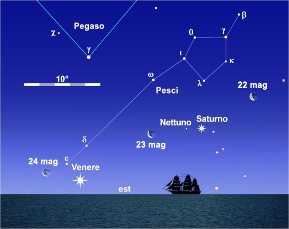 Tra il 22 e il 24 i tre pianeti vengono raggiunti dalla falce calante della Luna, che con il suo passaggio produrrà alcune belle configurazioni, rappresentate nel disegno, osservabili alle 04:00 TC delle date indicate, una ventina di minuti circa dopo l’inizio del crepuscolo astronomico.