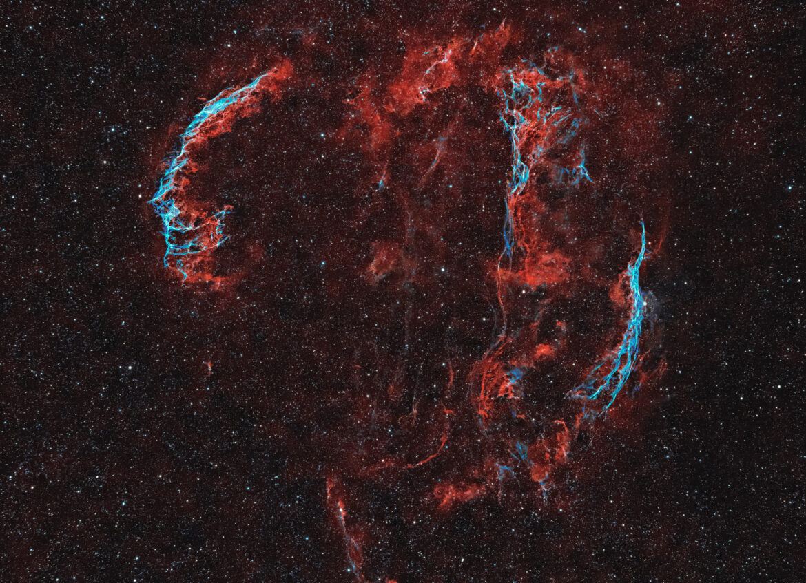 La Nebulosa Velo è un antico resto di supernova; la stella che ha originato quest’oggetto è esplosa diversi millenni fa. Ciò che ora è visibile sono dei debolissimi filamenti. La parte più luminosa è quella più ad est, nota come NGC 6992, mentre la parte più a ovest è nota come NGC 6960