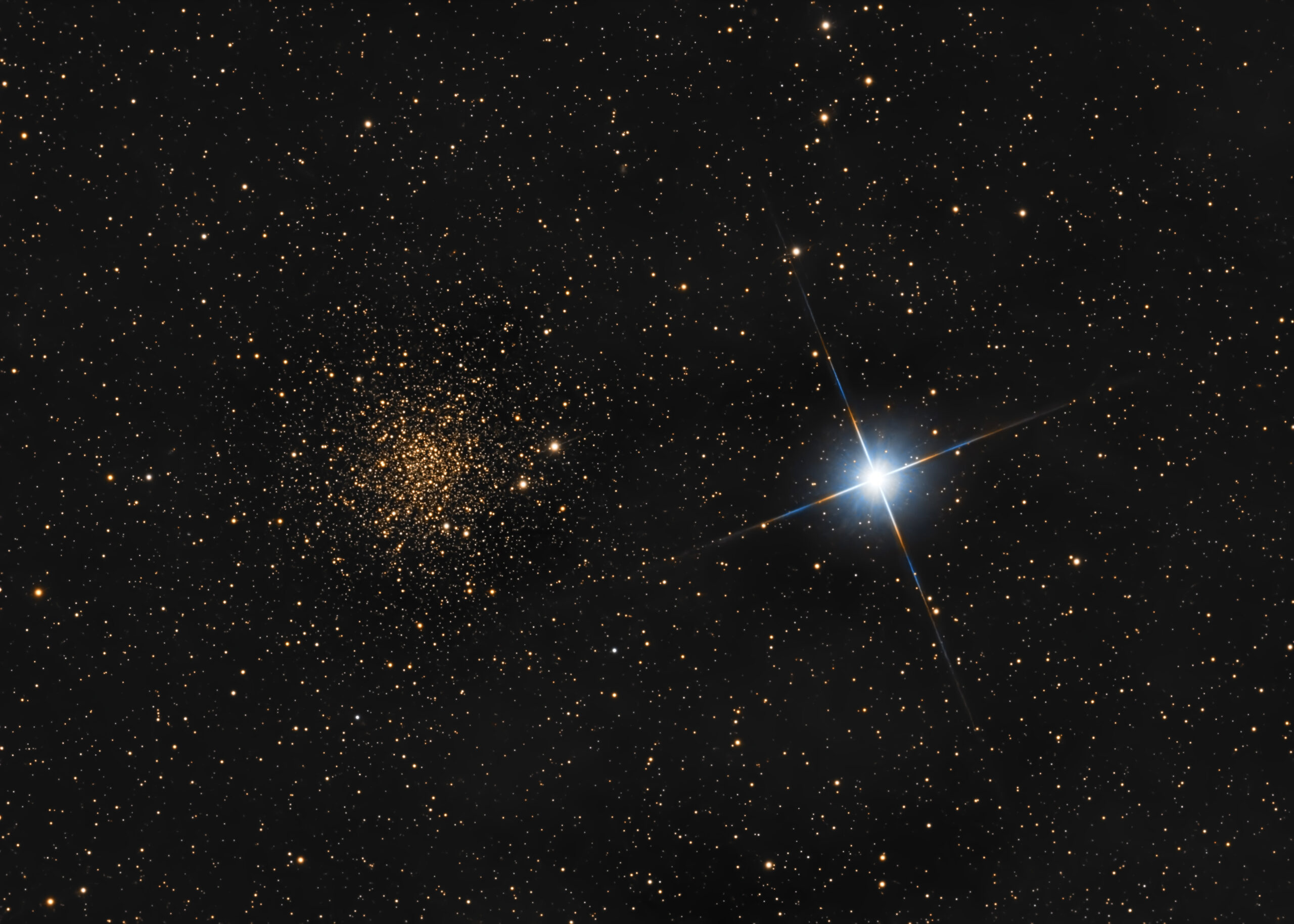 NGC 6366 è un ammasso globulare situato a 11700 anni luce dalla Terra, nella costellazione di Ofiuco, “arrossato” a causa dell’estinzione causata dalle polveri nel piano galattico. Pertanto, appare quasi dorato e forma un bellissimo contrasto cromatico con la stella blu HD 157950 in primo piano.