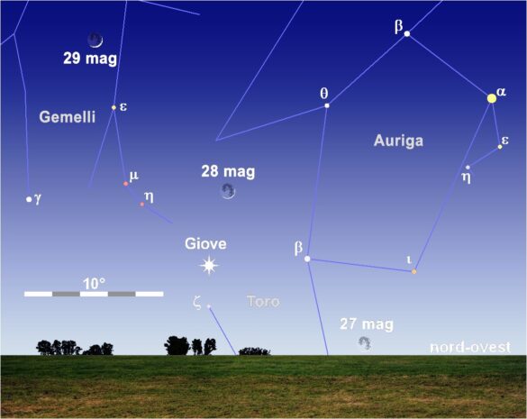 La visibilità di Giove va riducendosi sensibilmente e nelle ultime sere di maggio il pianeta cala ben prima dello spegnersi degli ultimi bagliori del tramonto. La sera del 28 è presente nelle sue vicinanze la falce crescente della Luna, che attraversa la costellazione del Toro, allontanandosi progressivamente dalle luci del crepuscolo serale. Così si produce una bella ed effimera configurazione celeste, con la Luna disposta 5°,5 “sopra” Giove. La sera seguente la Luna si è spostata quasi 18° a est del pianeta.
