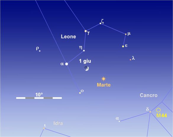 La sera del 1° giugno è possibile osservare la falce crescente della Luna tra Marte, a “destra” del nostro satellite naturale, e Regolo, a “sinistra”. Il transito della Luna un grado a nord del Pianeta rosso si è verificato nella tarda mattinata, mentre la congiunzione con Alfa Leonis, 51’ a sud della stella, si realizzerà nelle prime ore del giorno 2, dopo la scomparsa dei tre protagonisti sotto l’orizzonte occidentale.
