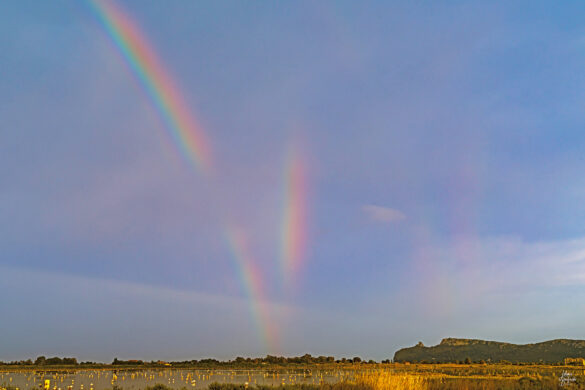 É un raro fenomeno di doppio arcobaleno di riflessione a cuspide. Si conoscono poche immagini scattate nel mondo, in Italia nessuna fino ad ora. Non è il classico arcobaleno riflesso, ma di riflessione. ll fenomeno ha origine quando nelle vicinanze c’è uno specchio d’acqua in questo caso (stagno di Molentargius) dove si rispecchia il Sole e quindi come se ci fossero due Soli, di conseguenza si formano quattro arcobaleni, invece che due.