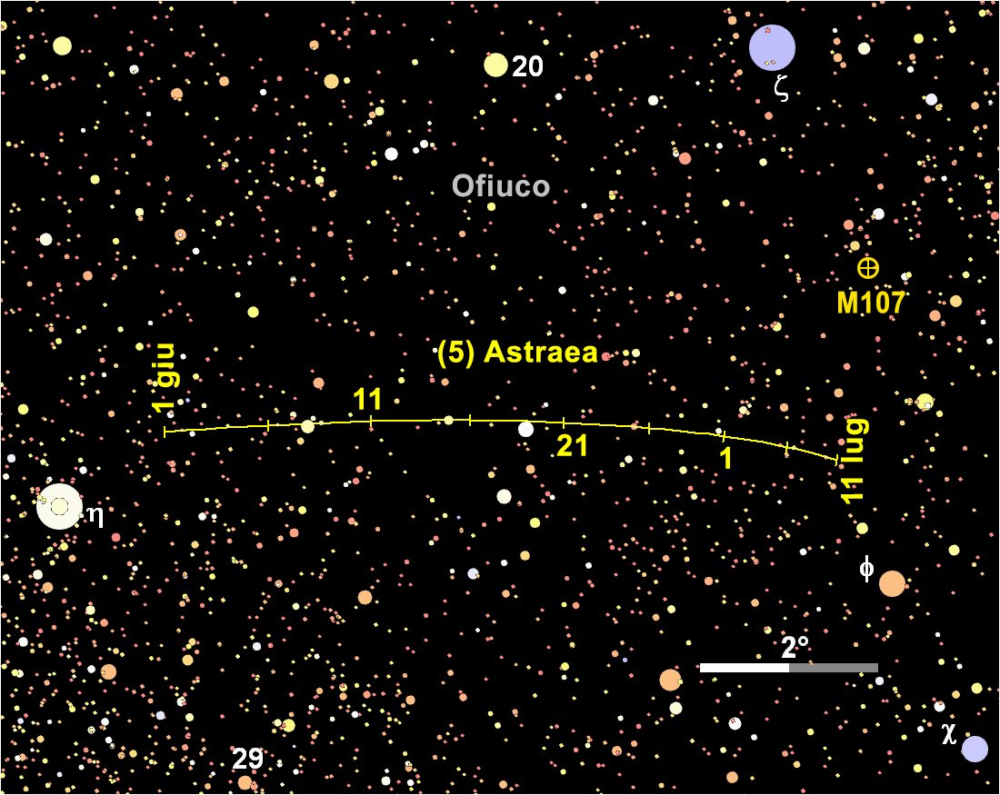 Nel corso del mese il pianetino (5) Astraea risulta sufficientemente luminoso per poter essere seguito con strumenti amatoriali. In opposizione al Sole il giorno 6, quando raggiunge la magnitudine visuale +10,6, (5) Astraea è rintracciabile nella costellazione dell’Ofiuco, circa 12° a nord di Antares (Alfa Scorpii).