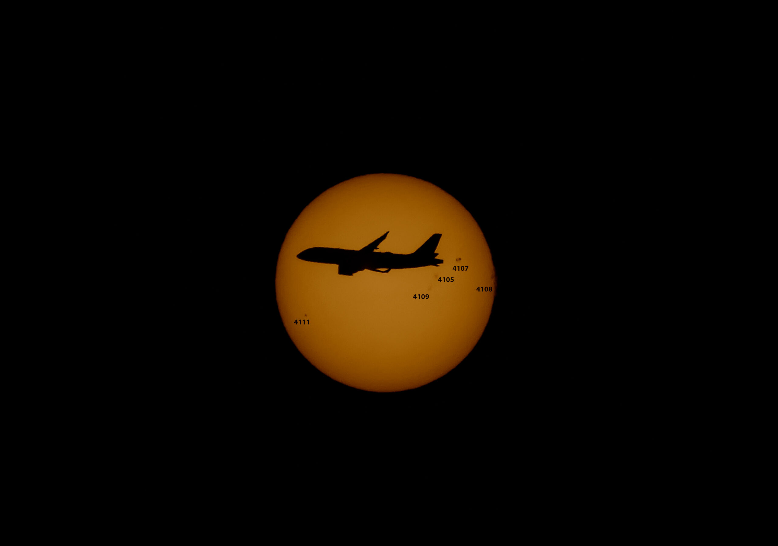 Un aereo in partenza alle 7.00 da Linate ripreso da casa mia con scatti in sequenza da F/9 1/640 sec 80 Iso e filtro nd K&F. Il Sole presentava diverse zone di macchie solari descritte nella foto. Non è mai facile riprendere un aereo davanti al Sole o Luna, questa volta dopo diversi tentativi ci sono riuscito
