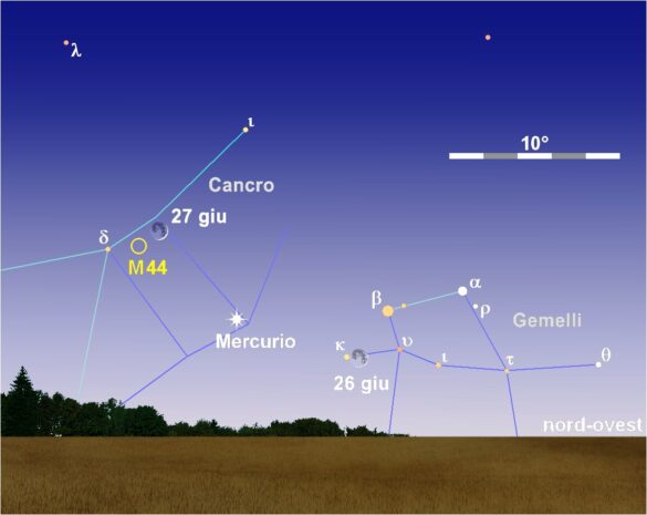 Nelle ultime sere del mese, Mercurio, nel periodo di massima visibilità serale della corrente apparizione, viene superato dal falcetto lunare, in crescita dopo il Novilunio. Con un binocolo, la sera del 26 poco più di 3° a nord della Luna è possibile osservare Polluce (Beta Geminorum), che si troverà in congiunzione lunare meno di un’ora dopo la loro discesa sotto l’orizzonte, mentre è visibile Mercurio 8° a “sinistra” della stella, nella costellazione del Cancro.