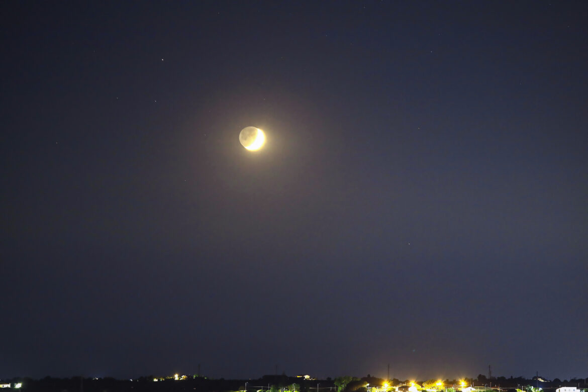 L’incastro del tramonto lunare tra Marte in alto a sinistra, stella regolo in basso a destra