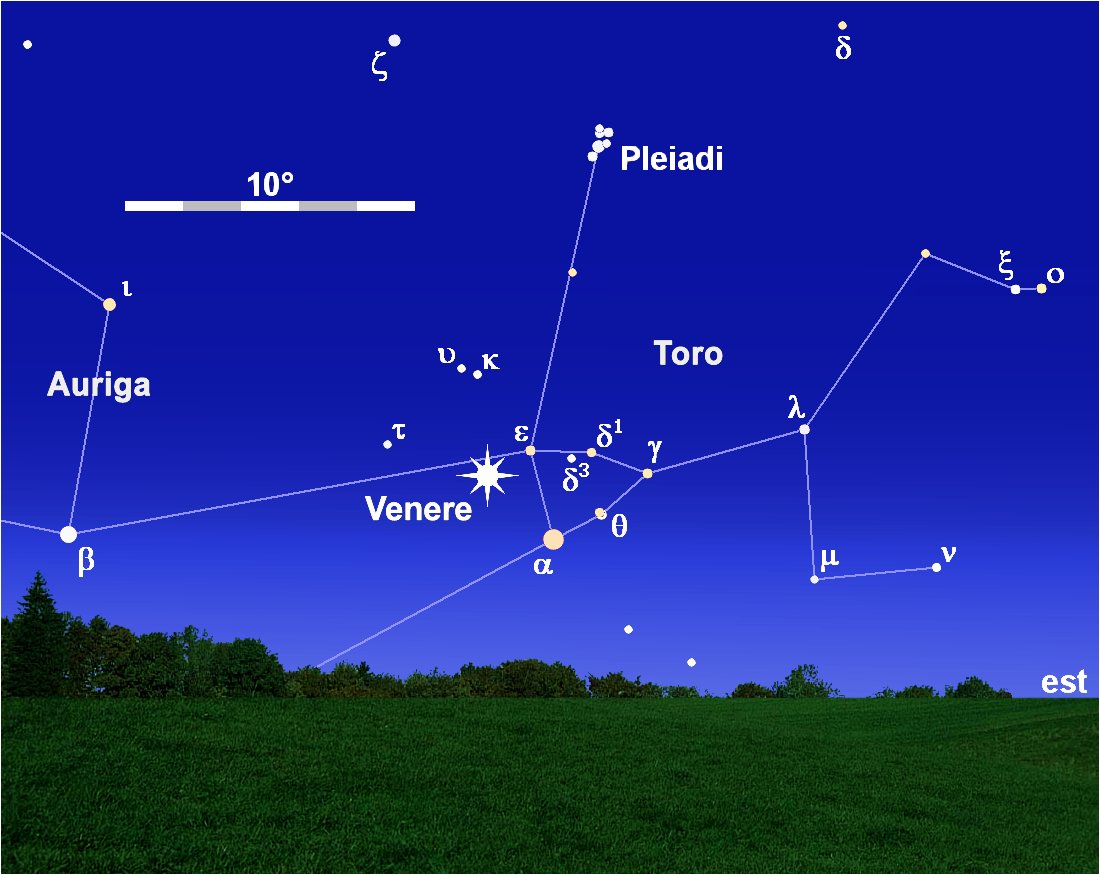 Una bella configurazione celeste che è possibile ammirare di mattina, poco prima della comparsa delle luci dell’alba, è quella che si realizza il giorno 14, quando Venere, che si sposta verso levante di oltre 1° al giorno, transita 3°,2 a nord di Alfa Tauri. La congiunzione tra il pianeta e la stella si verifica con il Sole sorto da poco.
