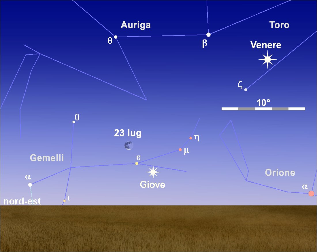 La visibilità mattutina di Giove va rapidamente aumentando e nell’ultima frazione del mese la levata del pianeta, che si sposta animato da lento moto diretto tra le stelle dei Gemelli, inizia ad anticipare le prime luci dell’alba. La mattina del 23 la falce calante della Luna, a meno di 2 giorni dal plenilunio e già molto sottile, raggiunge Giove, passando 4°,3 a nord del pianeta, ancora relativamente basso sull’orizzonte, un’ora prima della levata del Sole.