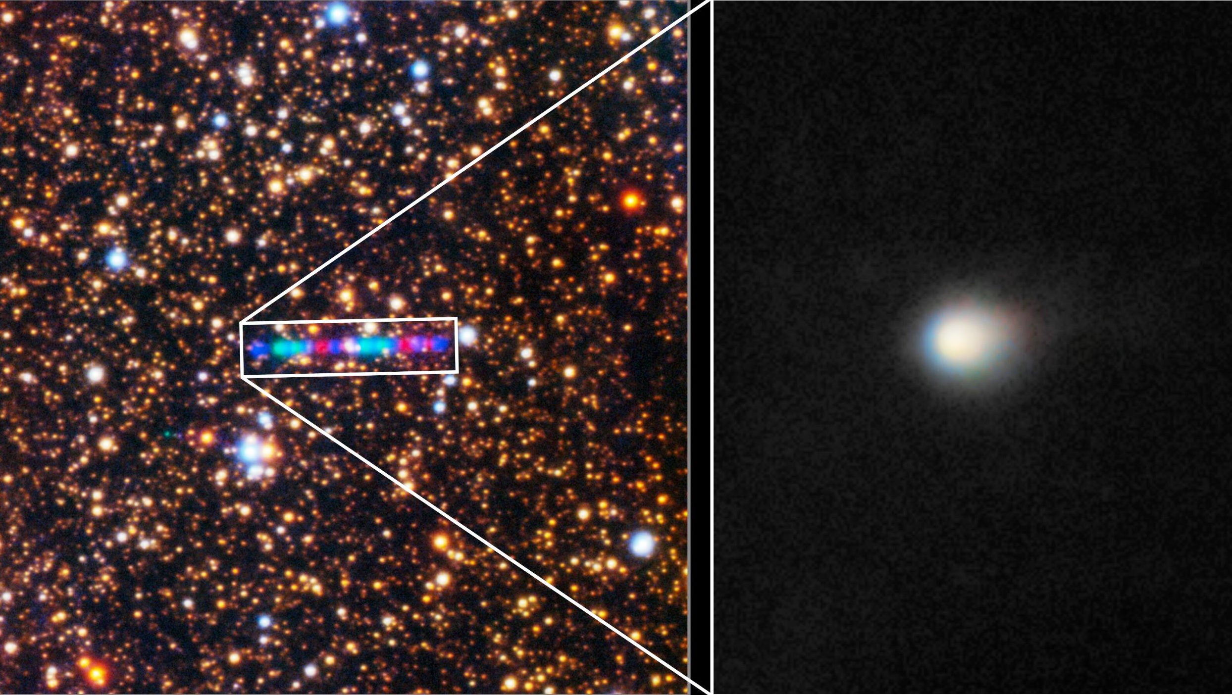 Nell’immagine di apertura, ripresa dal telescopio Gemini North, la 3I/Atlas sfreccia attraverso un denso campo stellare. A sinistra, la scia colorata della cometa mentre si muove attraverso il Sistema solare. L’immagine è stata composta da esposizioni scattate con tre filtri, mostrati qui in rosso, verde e blu. Il riquadro di destra è un ingrandimento che mostra la chioma compatta della cometa, la nube di gas e polvere che circonda il suo nucleo ghiacciato.