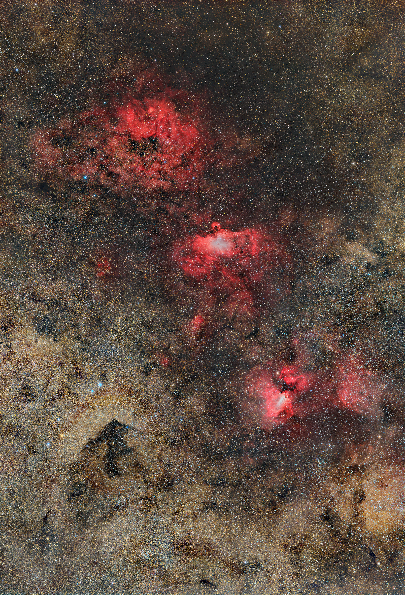 M16 (la Nebulosa Aquila), M17 (la Nebulosa Omega), e SH2-54 sono tre nebulose a emissione situate nella costellazione del Sagittario e della Coda del Serpente. Queste nebulose sono parte di un vasto complesso nebuloso e sono associate a fenomeni di formazione stellare. SH2-54 è la più grande e contiene al suo interno l’ammasso aperto NGC 6604, mentre M16 e M17 sono più vicine e mostrano segni di formazione stellare più recente.