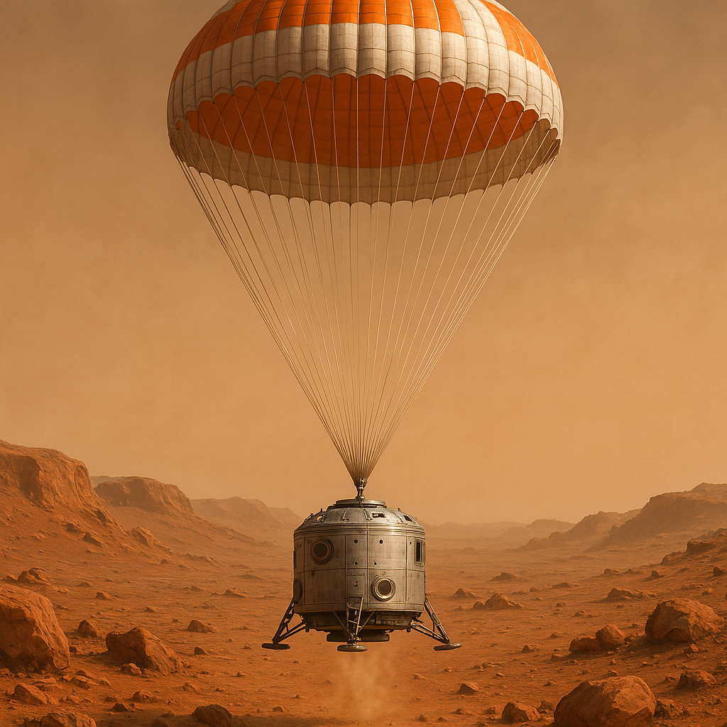 Il primo paracadute ha un diametro di 15 metri, simile a quello usato dalla missione Viking della NASA nel 1972. Il secondo, il vero gigante, misura 35 metri di diametro ed è formato da una rete di anelli con spazi vuoti progettati per stabilizzare la discesa finale. È il più grande paracadute spaziale mai costruito per una missione interplanetaria: oltre 800 metri quadrati di tessuto, più di 4 chilometri di corde, piegato a mano in tre giorni con una precisione millimetrica.