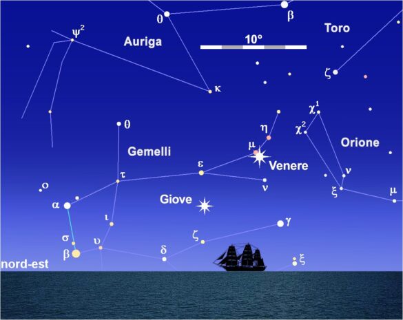 Poco prima dell’accendersi delle luci dell’alba una decina di gradi sopra l’orizzonte nord-orientale spicca la luminosa presenza di Venere, seguita, 7° a oriente, da quella un po’ meno brillante di Giove. Meno di 30’ a nord di Venere, quasi nascosta dal chiarore di quest’ultimo, è possibile scorgere, eventualmente con l’aiuto di uno strumento, la ben più debole scintilla di Mu Geminorum, una stella gigante rossa di 3a magnitudine debolmente variabile.