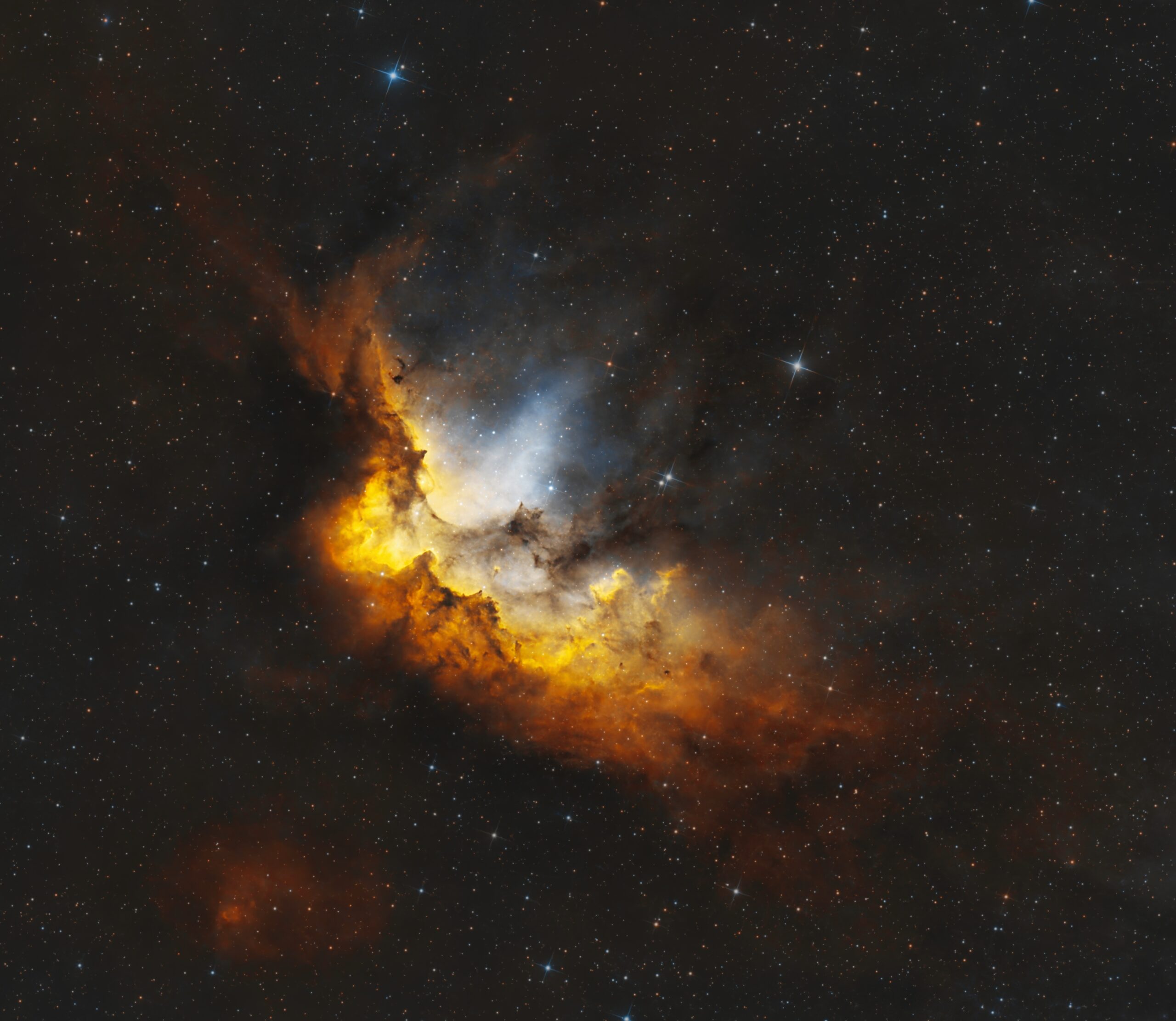La nebulosa Sh 2-142, nota anche come Nebulosa del Mago, ripresa in banda stretta per evidenziarne le strutture gassose scolpite dalle giovani stelle. L’immagine è il risultato di 7 ore di esposizione, realizzate con un telescopio Askar 107 PHQ e camera ASI294MC.