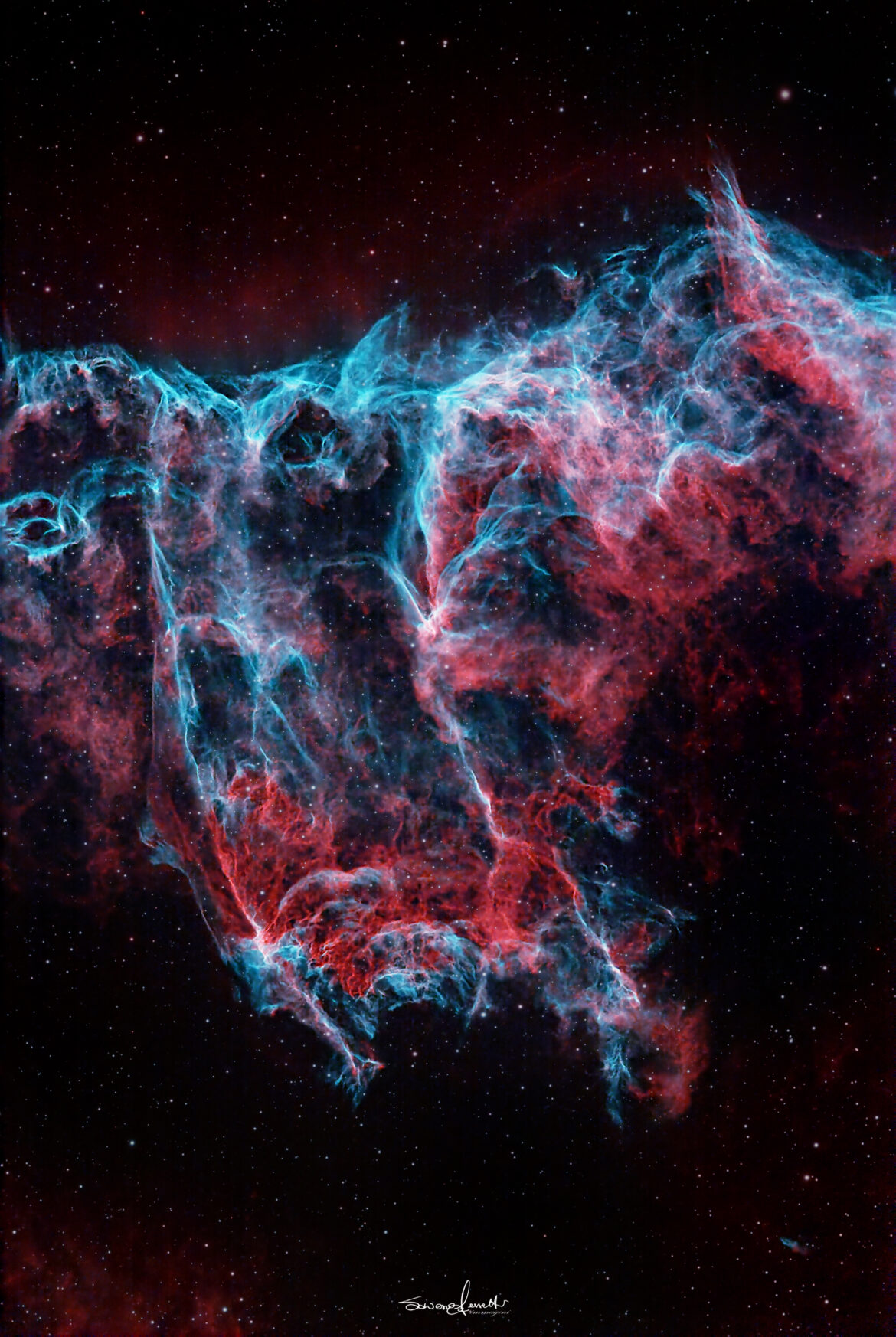 Nel cuore della costellazione del Cigno, tra i resti luminosi di una stella esplosa, si libra la Bat Nebula, un’ombra alata scolpita nel gas e nella luce.