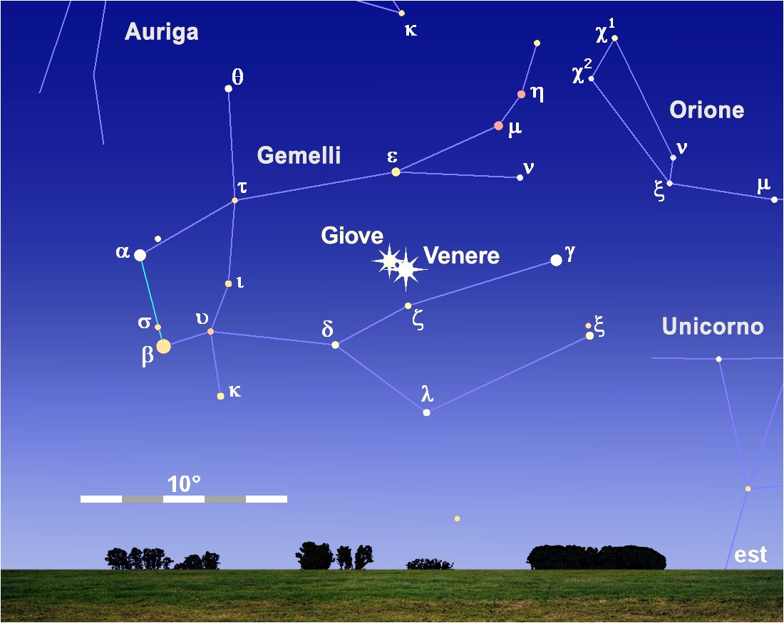 La luminosa coppia che domina il cielo che precede l’alba si stringe sempre più e la mattina del 12 il veloce inseguimento di Venere a Giove si conclude con il transito del primo 52’ a sud del secondo. La distanza che separa i due pianeti torna poi ad aumentare, al ritmo di un grado al giorno.