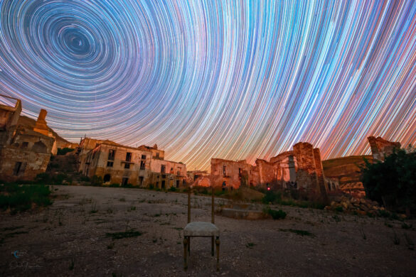 E’ la notte delle Perseidi e decidiamo di recarci presso i ruderi di Poggioreale. Tutto è immobile, immagine di un antico paese siculo abbandonato dopo il terremoto del 1968. Ci avviammo lungo la strada di accesso osservando dall’alto un antico abbeveratoio che, quasi per magia, è ancora alimentato con l’acqua; forse l’azione di un pastore locale che lì abbevera i propri greggi. Gli abitati si susseguono silenziosi come vecchi scheletri di pietra sicula di cui sopravvivono ancora le facciate, i balconi e talvolta i tetti affrescati. Arriviamo alla piazza, luogo centrale della vita di Poggioreale. Una singola sedia si trova al centro dello spazio e immediatamente siamo travolti dal senso di vuoto. E’ una semplice sedia, per altro parzialmente danneggiata, ma il suo potere simbolico è immenso. Essa rappresenta il vuoto, l’assenza, la solitudine, la vita sospesa. Essa è tutti gli abitanti che non ci sono più. La sedia è silenziosa ma grida un monito affinchè il luogo non si spogli dell’unica virtù che ancora possiede: la memoria. Una mangiatoia dentro una stalla, un antico forno, un soffitto con decorazioni affrescate, un teatro parzialmente distrutto, una chiesa senza tetto di cui rimangono solo gli stucchi, una macchina dei vigili sepolta dalle macerie, un frantoio in cui sopravvivono le presse. Tutto è ancora recuperabile alla memoria della storia siciliana ma gli edifici stanno crollando, le pareti si sgretolano inesorabilmente e le nuove generazioni si susseguono ignare del dramma che qui è accaduto. Inquadro la piazza e capisco che la sedia DEVE essere l’elemento centrale in barba alle regole di composizione fotografiche. Su di essa si eleva la Via Lattea e la costellazione di Perseo. Sulla sedia un grande occhio celeste è testimone inesorabile del trascorrere del tempo.
