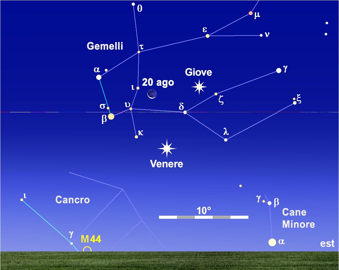 Dopo la congiunzione reciproca tra Venere e Giove, la mattina del 20 agosto i due luminosi protagonisti del palcoscenico celeste che precede le luci dell’alba distano ormai 8° l’uno dall’altro quando vengono affiancati dalla falce calante della Luna, in congiunzione con Giove, 3°,9 a nord del pianeta, la sera del 19 quindi 4°,4 a nord di Venere il pomeriggio seguente. Cinque gradi a est del nostro satellite naturale è visibile Polluce (Beta Geminorum), il più luminoso dei due gemelli dioscuri.