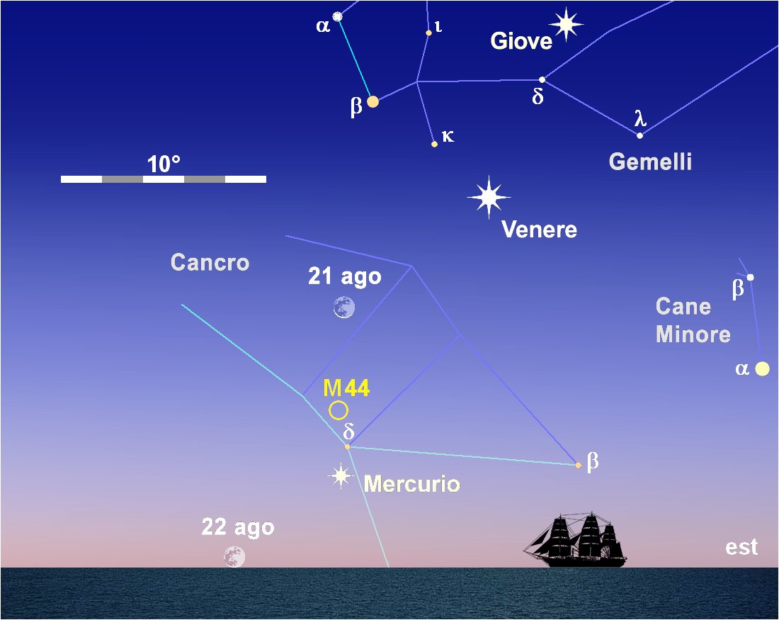 La migliore condizione osservabile è quella rappresentata nel disegno, con una sottile falce di Luna poco meno di 8° “sopra” Mercurio, e si concretizza alle 05:20 TC, all’inizio del crepuscolo nautico, con il cielo già discretamente illuminato dalle luci dell’alba. La mattina successiva il falcetto lunare è adagiato sull’orizzonte, 6° a ovest del pianeta, 4° a nord del quale si trova l’ammasso del Presepe, ben difficilmente visibile.