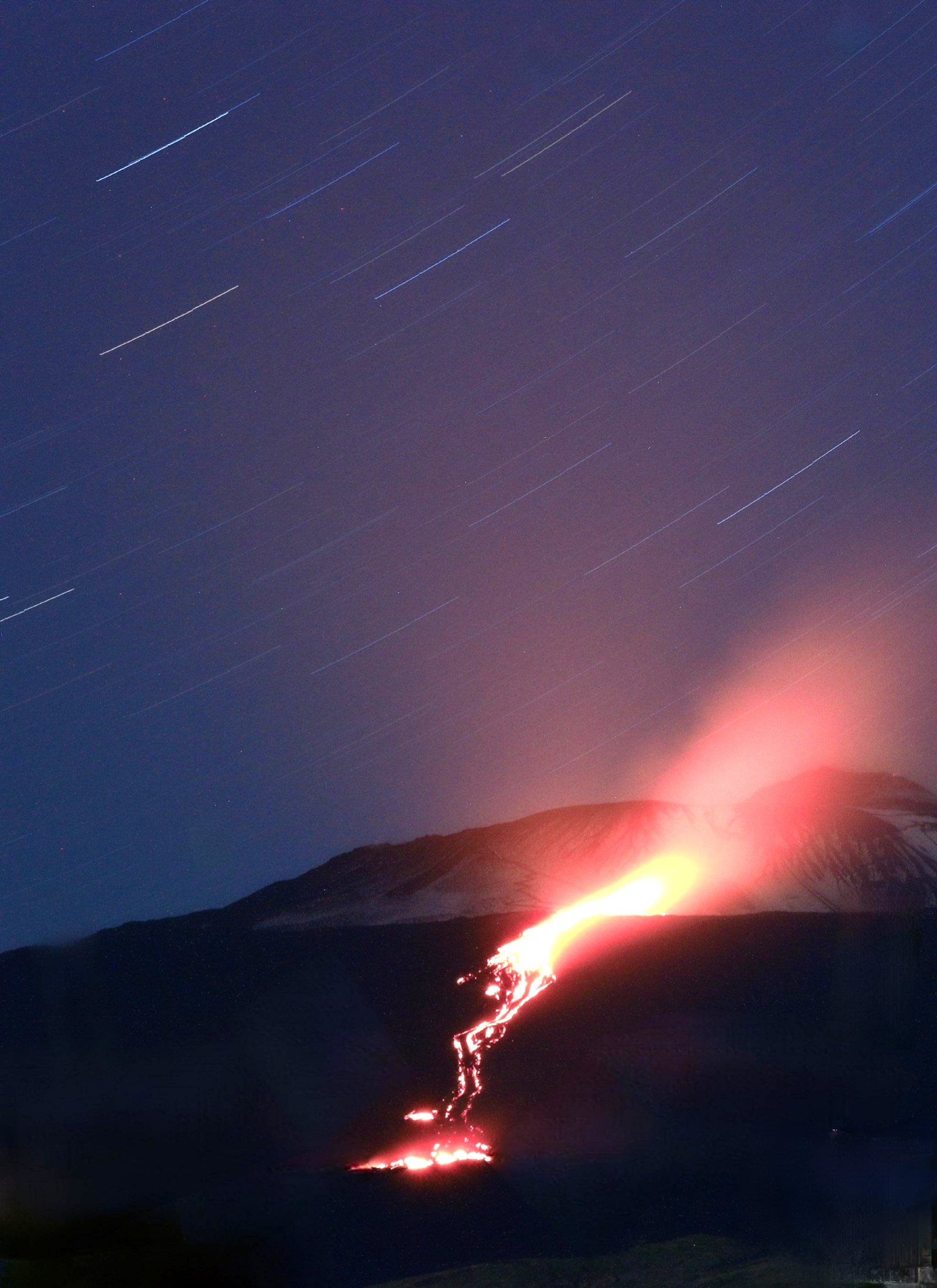Foto di GIOVANNI PASSALACQUA: Star trail sul vulcano Etna della nuova colata lavica nella parte più alta del vulcano, cioè i crateri sommitali