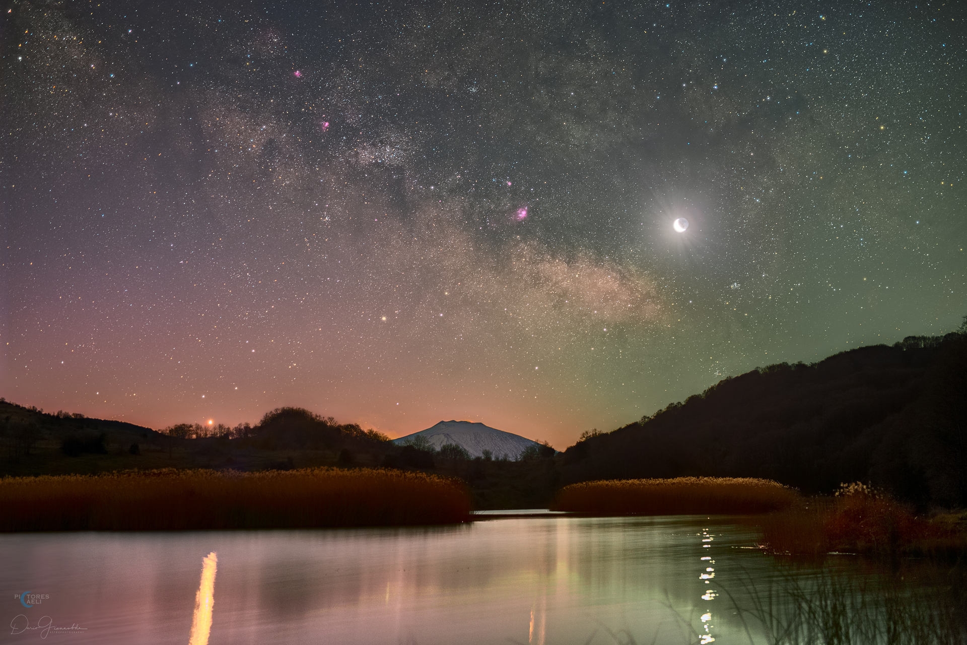 Per quanto riguarda il paesaggio, si tratta del lago Biviere di Cesarò situato a circa 1200 metri sul livello del mare, circondato dalle montagne dei Nebrodi. Nelle sue acque crescono piccoli isolotti di canne lacustri, sopra i quali si erge il vulcano Etna. In basso a sinistra, l’immagine è arricchita dalla presenza di Venere, che proietta il suo riflesso sulle acque placide del lago.