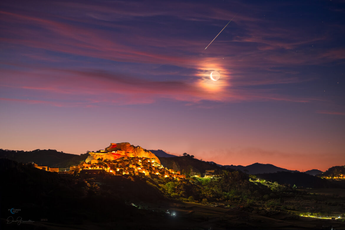 I francesi resistettero all’assedio per un anno circa tra il 1282 e il 1283 prima di arrendersi. L’immagine mostra il paese con il suo castello allineato con l’Enta di cui si intravede la sommità. Sono le ore che precedono l’alba. Il cielo è blu ma i bagliori del sole nascente illuminano di rosso le velature nuvolose che si distendono sopra la campagna. Un particolare allineamento di astri rende la suggestione unica: la Luna a falcetto in luce cinerea circondata da un’aureola, il pianeta Marte e una bellissima stella cadente appartenente allo sciame delle Eta Aquaridi.