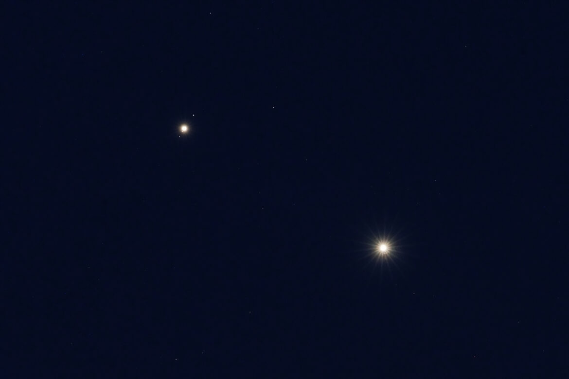 Questa immagine della congiunzione tra Giove e Venere è stata ripresa la mattina del 12/8/2025 dalla Colma di Sormano (CO), località di montagna dove si trova un piccolo osservatorio. L’immagine (15s, f/22, ISO1600, lunghezza focale 560mm) mostra Giove e i suoi satelliti (in alto a sinistra) e Venere (in basso a destra).