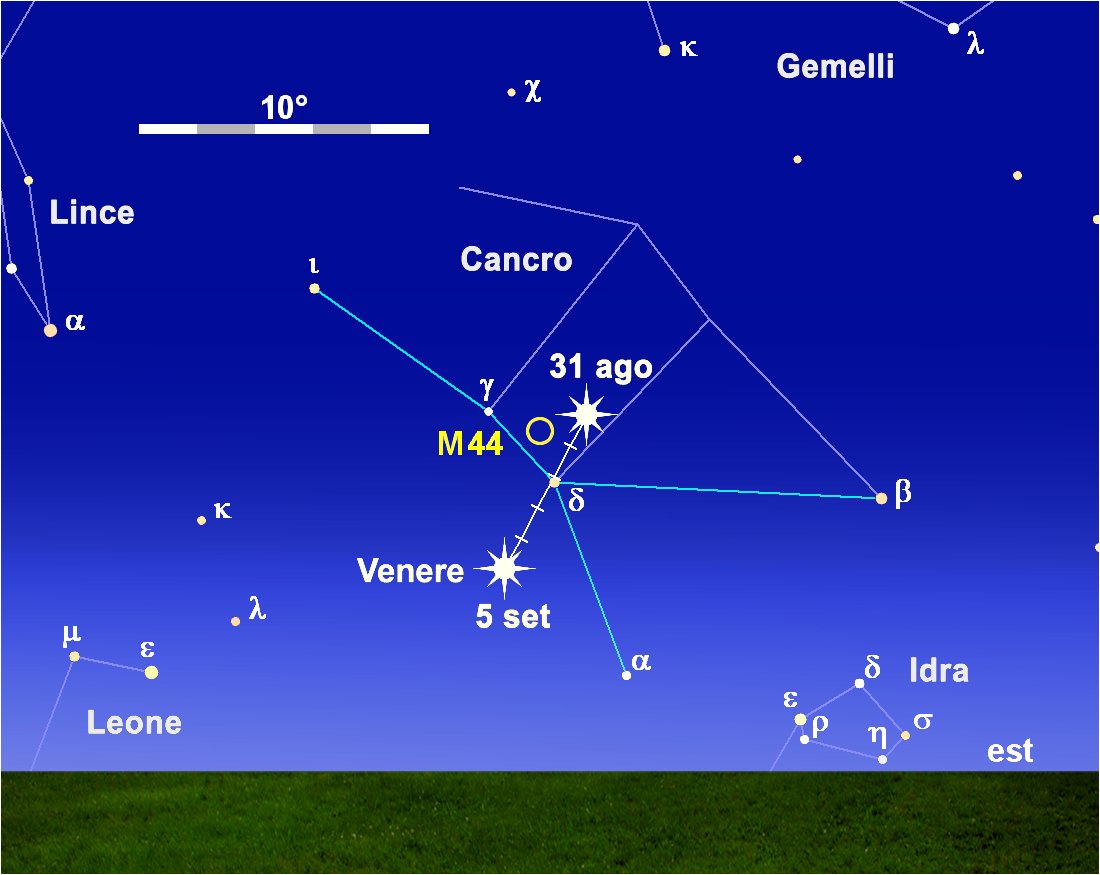 Pochi istanti prima che il cielo inizi a rischiarare per l’approssimarsi dell’alba, sull’orizzonte orientale è possibile ammirare Venere mentre attraversa rapidamente la costellazione zodiacale del Cancro, transitando poco più di 1° a sud dell’ammasso di stelle M44 (il “Presepe”) e, un giorno più tardi, 7’ a nord della stella Delta Cancri, di magnitudine +3,9.