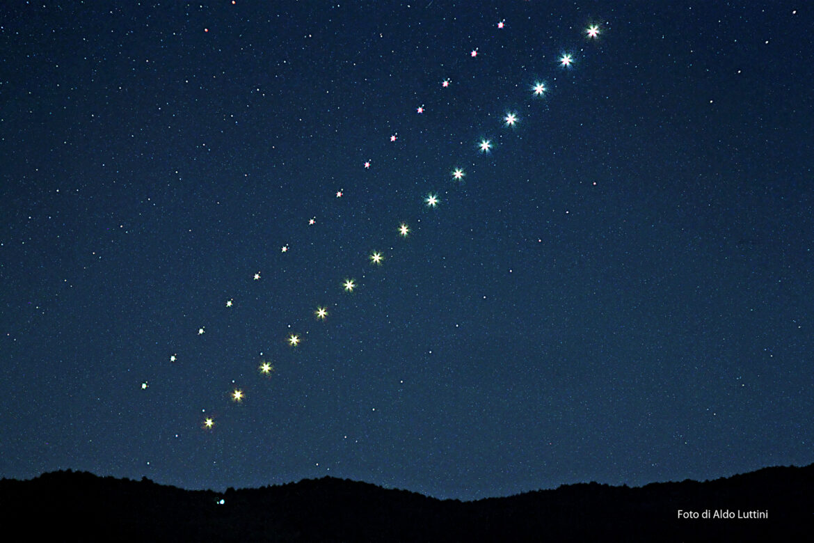 Canon 500D con ob.a F 216 f 2.8, 15 pose da 1sec. a 1600 iso,distanziate di 2m.una dall’altra, dalle ore 03.52 alle 04.20.