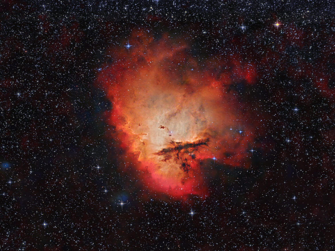 La nebulosa Ngc 281, detta anche nebulosa Pacman, E’ una tipica nebulosa a emissione, in cui la materia, per lo più idrogeno, viene eccitata da una o più stelle molto calde. Lontana circa 9500 anni luce, ha al centro la stella multipla HD 5005. Circa un quarto della nebulosa è coperta da una sovrapposizione di polveri ed è questo il motivo della sua forma particolare, che attira l’attenzione sia dal punto di vista fotografico che visuale e che ricordava, a chi la osservava negli anni Ottanta, il famoso personaggio di un videogioco. Oggi questo piccolo oggetto viene chiamato anche nebulosa Pacman e sembra davvero che si stia mangiando la nube di polveri.