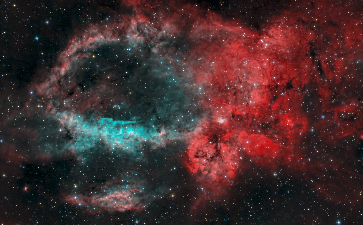 Questa nebulosa si trova nella costellazione di Cassiopea, a circa 8.000 anni luce da noi. È una regione H II, cioè una vasta nube di idrogeno ionizzato, dove la nascita stellare è ancora in corso. Le forme a “chela” sono scolpite dalla potente radiazione ultravioletta di giovani stelle massive, che modellano il gas e la polvere circostanti.