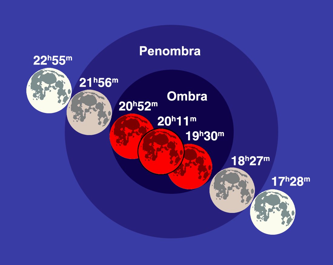 Nelle tarde ore pomeridiane il nostro satellite naturale si trova a transitare nella frazione meridionale del cono d’ombra della Terra, venendo completamente eclissato per 82 minuti tra le 19:30 e le 20:52 di Tempo Civile. L’eclissi, di tipo totale (magnitudine 1,362), è visibile da Europa, Africa, Asia, oceano Indiano, Australia e in parte anche dall’Italia, con l’esclusione delle fasi iniziali.