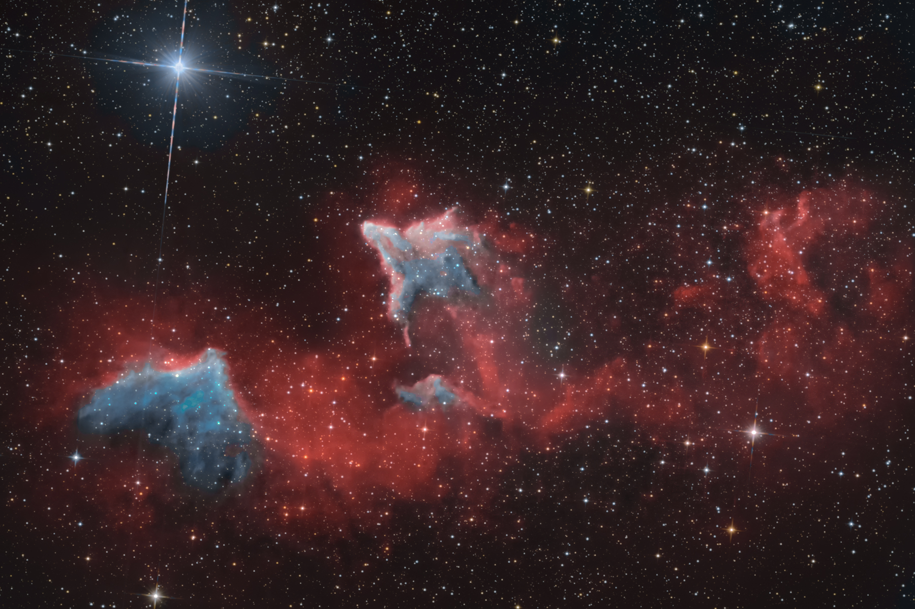 IC63 è la più vicina alla stella e mostra una forte emissione di idrogeno ionizzato, che le conferisce un bagliore rossastro.