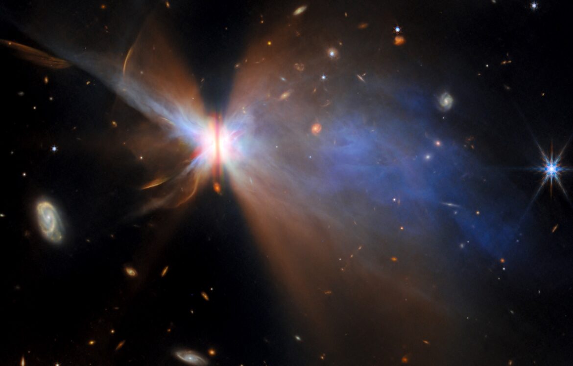Iras 04302 è un disco protoplanetario largo 65 miliardi di km, con la forma di una farfalla, che è destinato a trasformarsi in un sistema planetario. Ciò che osserviamo in questa immagine è il suo profilo visto dalla prospettiva del telescopio spaziale James Webb: orientato di taglio, lo vediamo come una sottile linea scura di gas polveroso che blocca la luce proveniente dalla protostella in formazione al suo centro.
