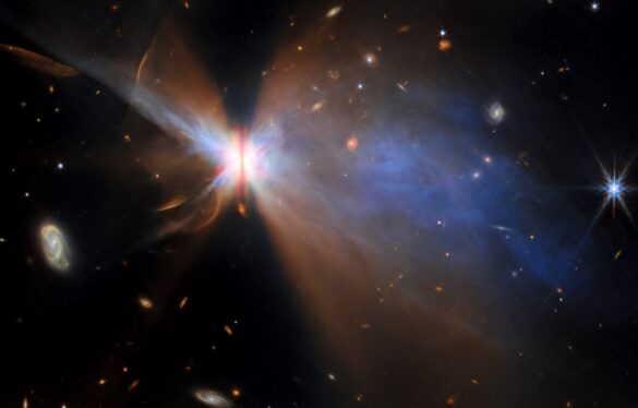 L’immagine è il risultato della combinazione delle riprese nell’infrarosso dalle camere Nircam e Miri del Webb con quelle eseguite nella banda ottica del telescopio spaziale Hubble. Si possono notare numerose galassie lontane sullo sfondo.