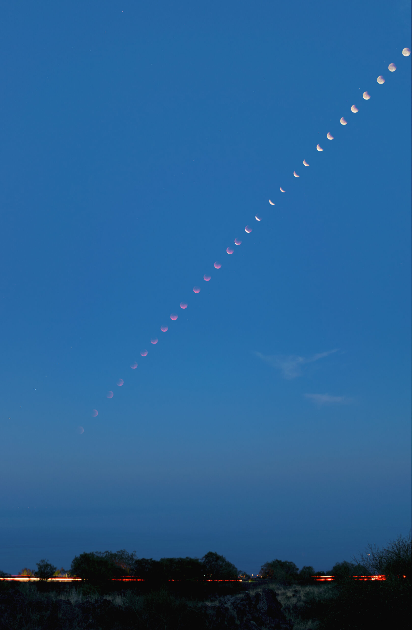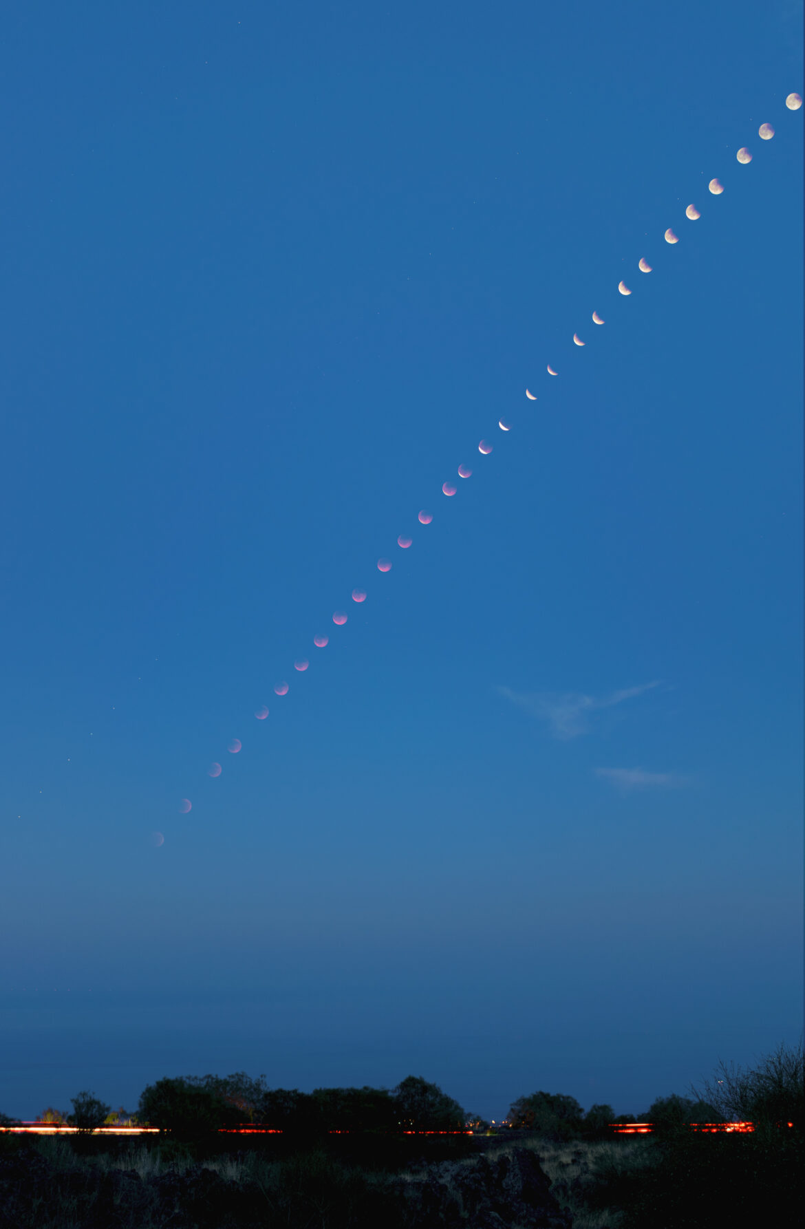 Sequenza di immagini ottenute durante l’eclissi di Luna del 7 Settembre 2025. La Luna sorge dalle coltri di nebbia sopra il Mare Jonio già interamente eclissata. La sequenza copre un arco temporale che va dalle 19:30 alle 21:55 ora locale, con un intervallo tra le pose di 5 minuti.